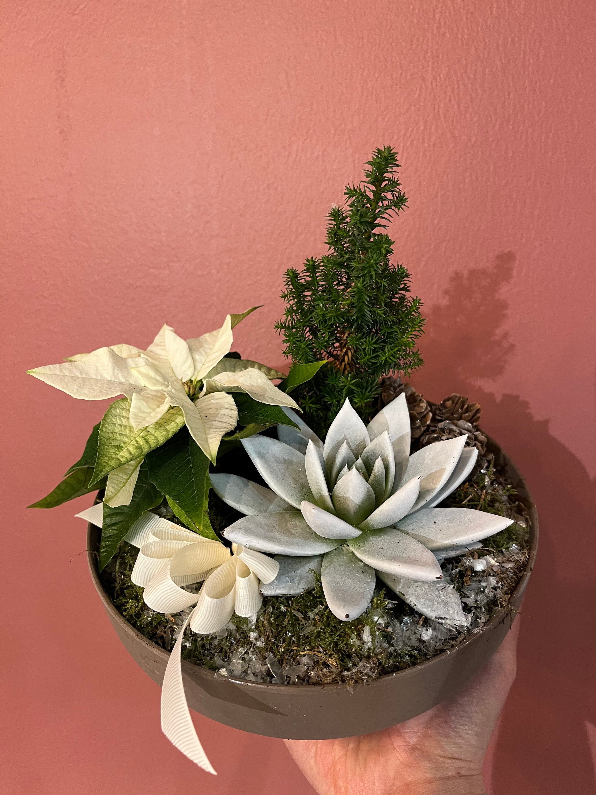 Liten søt sammenplanting med mini tre, julestjerne og succulent.