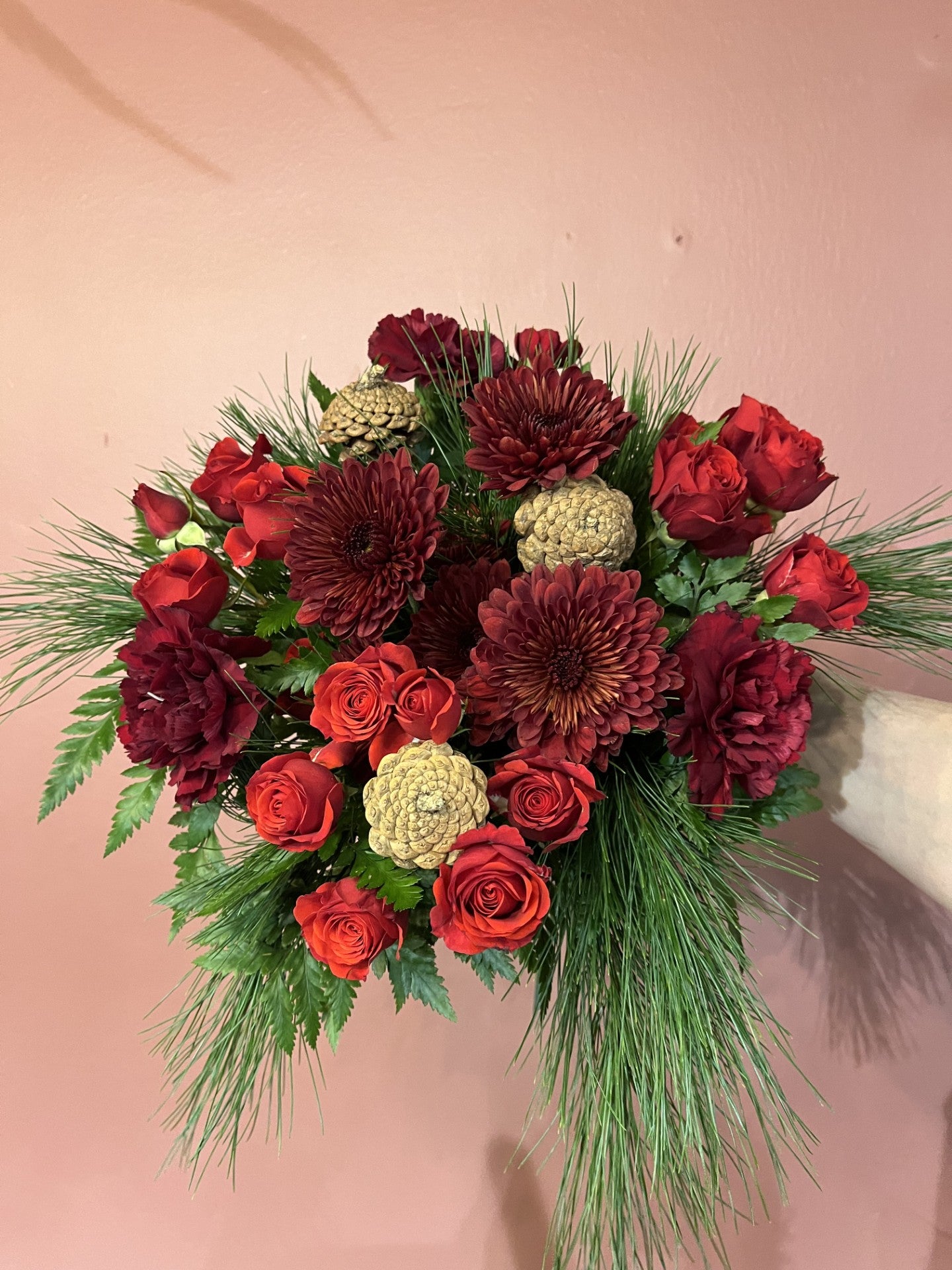 Flott rød julebukett med blomster i forskjellige rødtoner